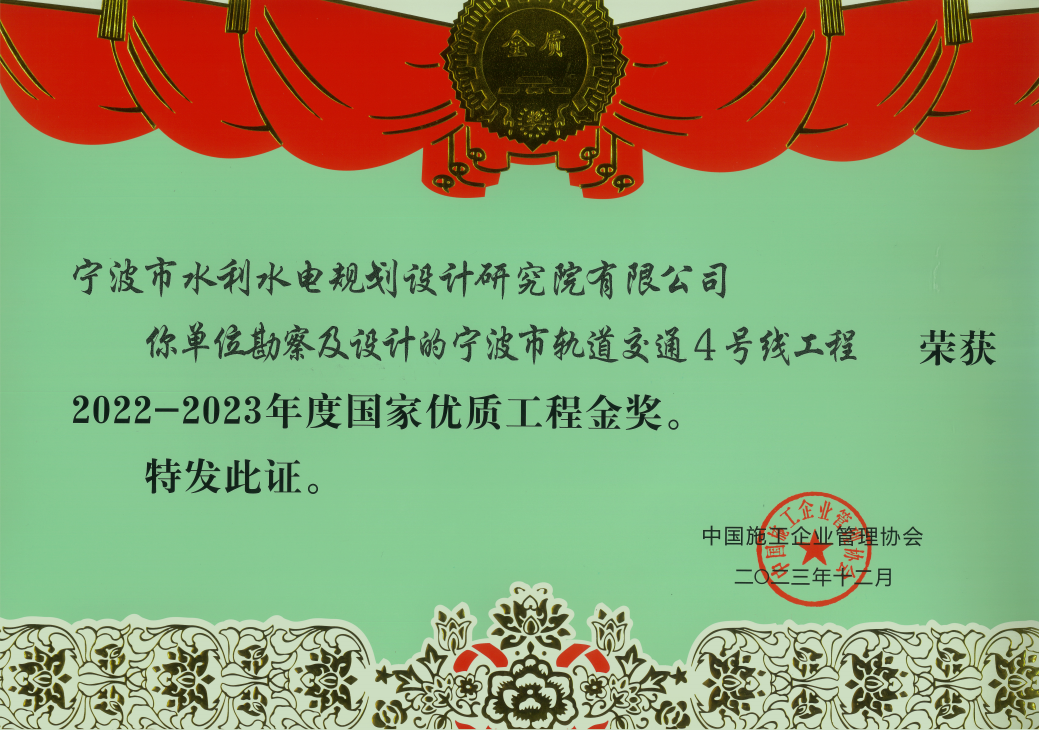 2023年我院多個項目在各類評比中脫穎而出,榮獲中國水利工程優(yōu)質(大禹)獎、國家優(yōu)質工程金獎、全國優(yōu)秀工程咨詢成果三等獎、浙江省水利科技創(chuàng)新獎、浙江省水土保持學會第三屆優(yōu)秀設計三等獎、“浙江省文明標化工地”稱號、2023 年度寧波市建設工程優(yōu)秀勘察設計獎、2023年度寧波市“甬江建設杯”優(yōu)質工程獎、寧波市水利科技創(chuàng)新獎、寧波市水利學會優(yōu)秀論文獎等各類榮譽20余項。